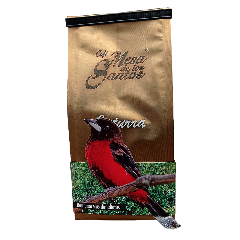 La presentación emblemática de Café Mesa de los Santos, variedad Caturra, en tostión media x 340 gr. Disponible en Grano o Molido.