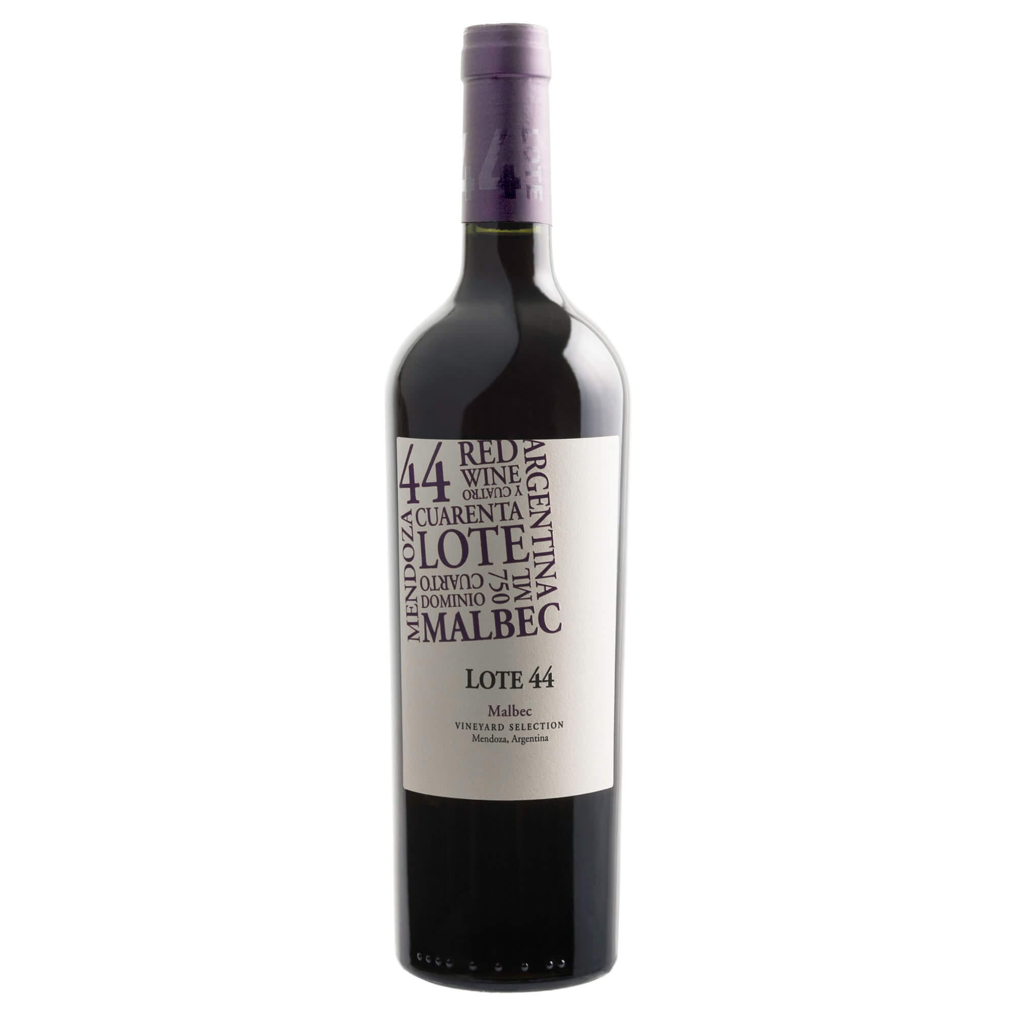 Vino tinto Argentino marca Lote 44. Elaborado a partir de la cepa Malbec, vino color rojo rubí con aromas intensos y complejos, que presenta notas a moras maduras, ciruelas y especias y posee un final prolongado, siendo ideal para maridar con carnes rojas, acompañadas de puré de papas o vegetales.